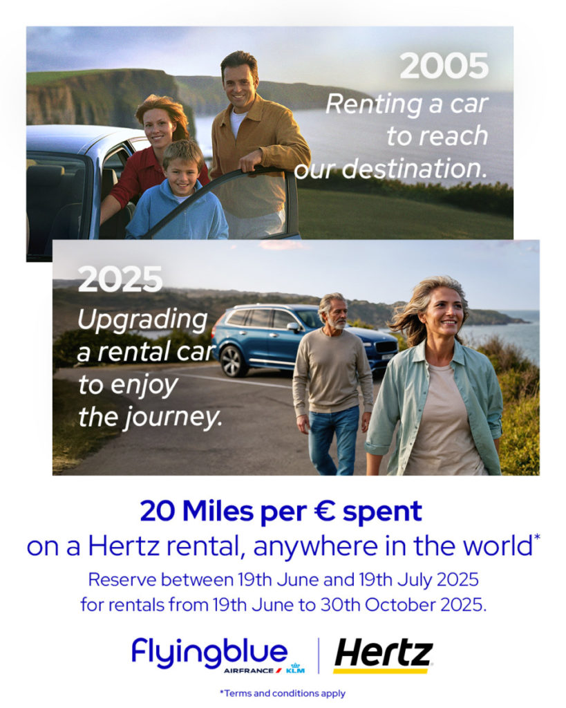 Loyaliteitsprogramma Flying Blue blaast 20 kaarsjes uit en viert dat met diverse promoties. Zo was er eerder al een actie waarbij je 20% bonus miles kreeg voor vluchten met KLM, Air France en Transavia. Nu is er weer een nieuwe Flying Blue actie, maar dan in samenwerking met Hertz. Je kunt namelijk tijdelijk tot 70% bonus miles verdienen per uitgegeven euro.