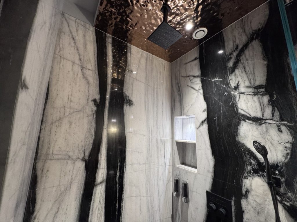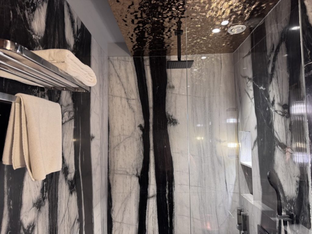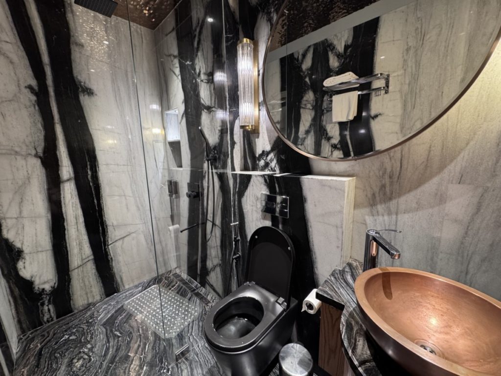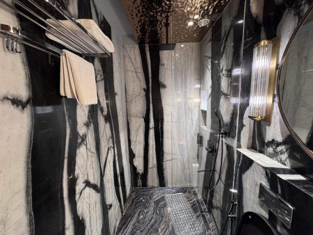 Er zijn doucheruimtes, toiletten en er zou ook een spa moeten zijn. De doucheruimtes zijn mooi ingericht met een nette zwartwit marmer look, bronzen wastafel en ruime inloopdouche. Ondanks dat, vind ik het jammer dat er geen luxere amenities aanwezig zijn, maar enkel zeep uit een flacon. Ook het toilet laat al wat slijtage zien. De regendouche is overigens fijn en de hele ruimte is netjes.
