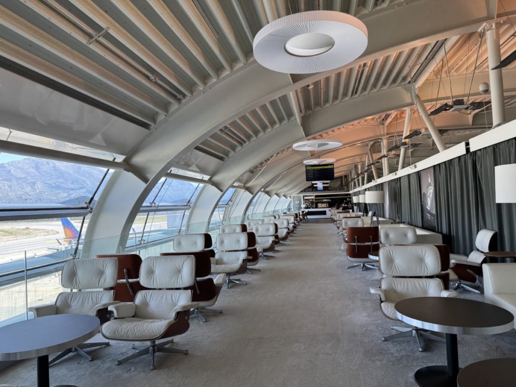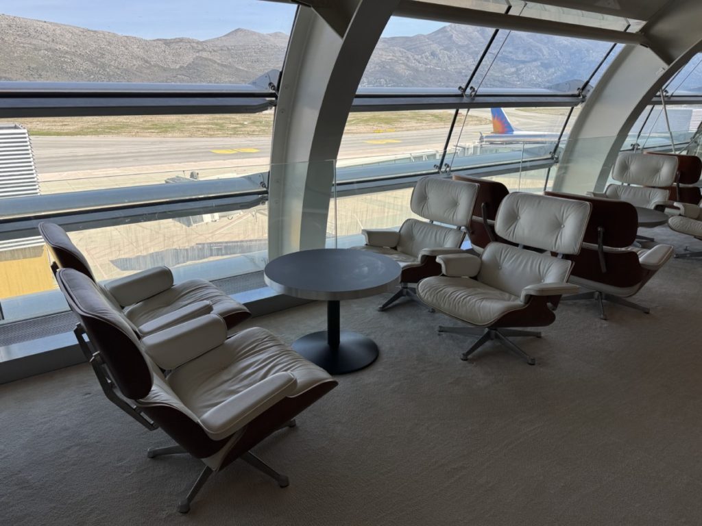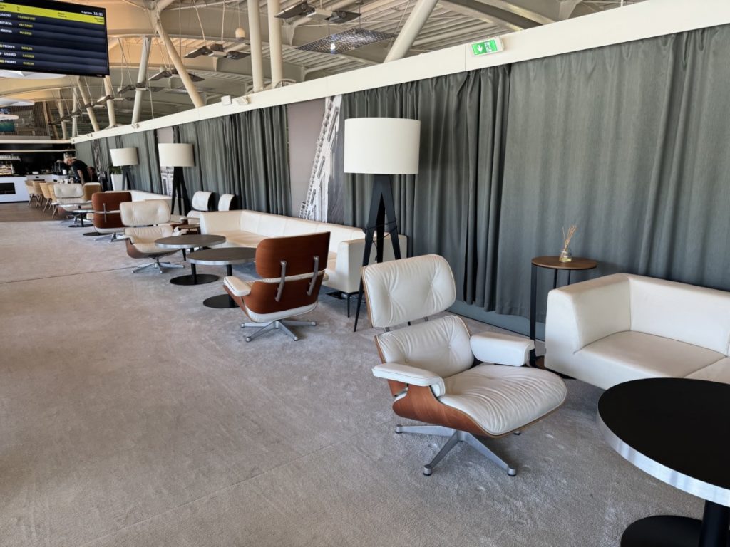 Het zitgedeelte ziet er strak en modern uit. Wat mij eerst opviel is dat je hier helemaal in het topje van de terminal zit, mét een mooi uitzicht op de vliegtuigen. Langs de ramen vind je mooie zetels die me gelijk wat luxer aandeden dan ik gewend ben in een Priority Pass lounge. Deze stoelen kunnen ook draaien.