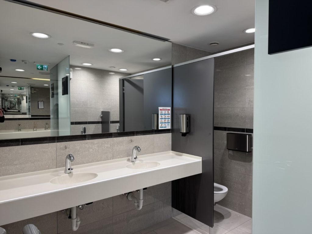 Achter de balie vind je de sanitaire voorzieningen. Deze bestonden uit toiletten en wastafels om je even op te frissen voor de vlucht.