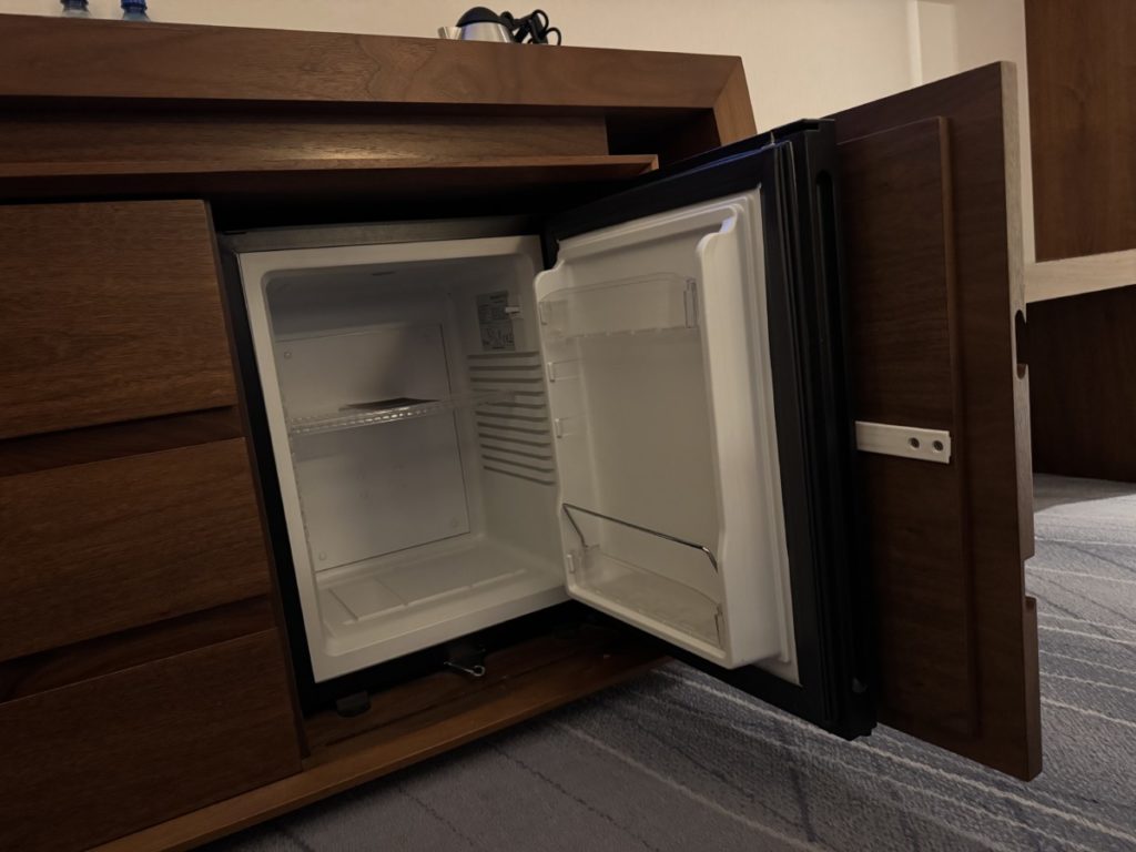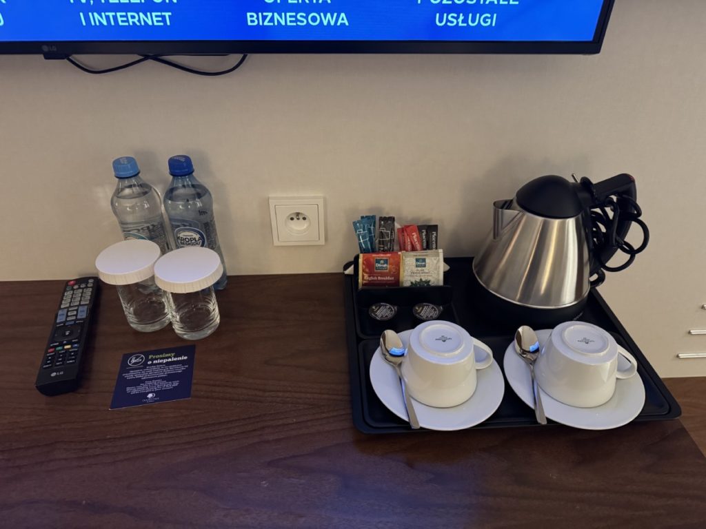 Tegenover het bed vind je een moderne televisie aan de muur. Onder de televisie vind je ook de koffie- en theefaciliteiten. Ook trof ik er twee flesjes water aan. Daaronder bevindt zich ook nog een minibar maar deze was leeg.