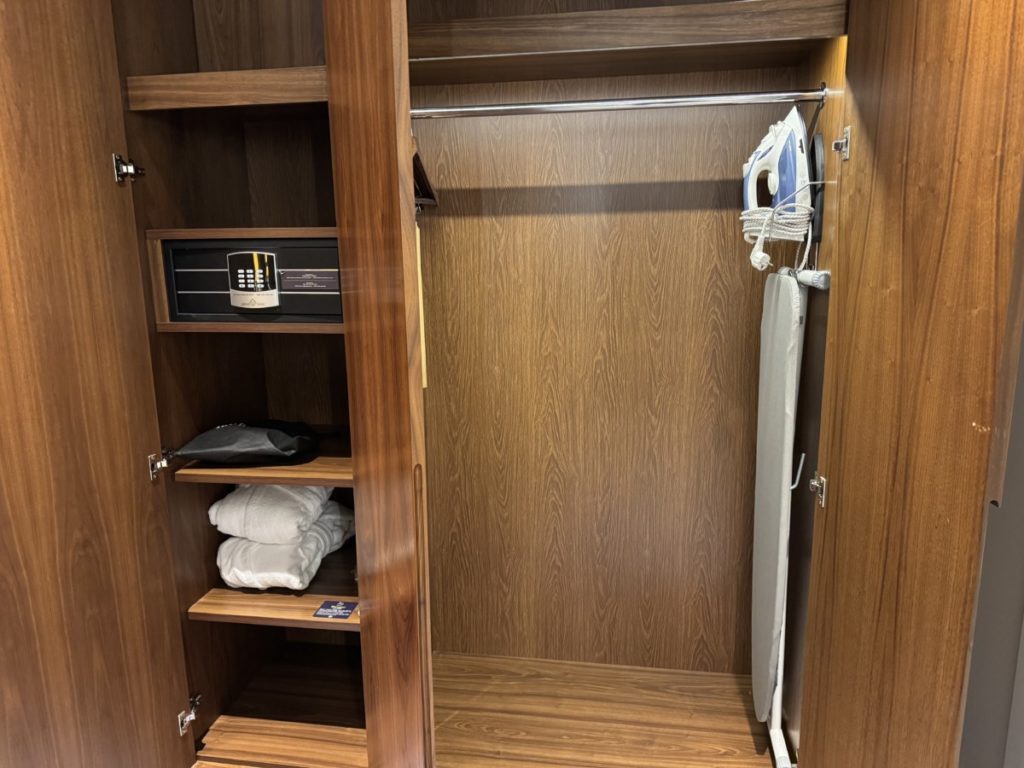 Direct rechts van de ingang bevindt zich een kast met o.a. een strijkplank, ruimte voor kledingstukken, een kluis en de badjassen. In de kast zelf is ook gebruik gemaakt van lichtdecoratie.