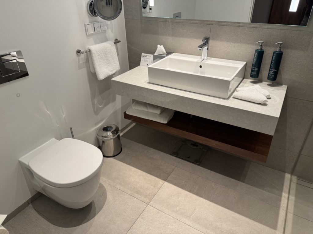 Ook in de badkamer was verder alles prima in orde. De ruimte bestaat uit een wastafel, toilet en douche. Er is dus geen bad aanwezig maar gelukkig wel een regendouche. Dit had ik uiteraard ook niet anders verwacht. De zeep en shampoo was van het merk GrabTree.