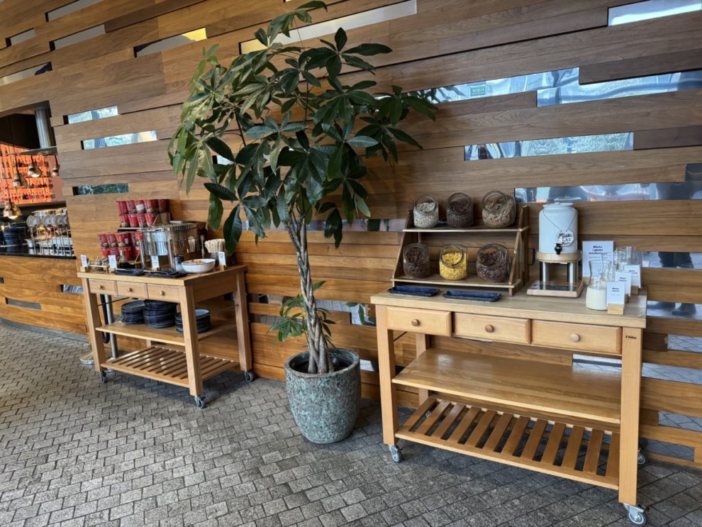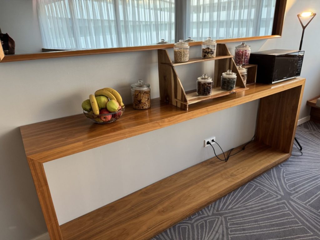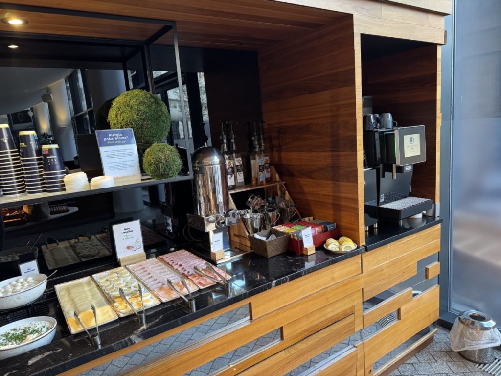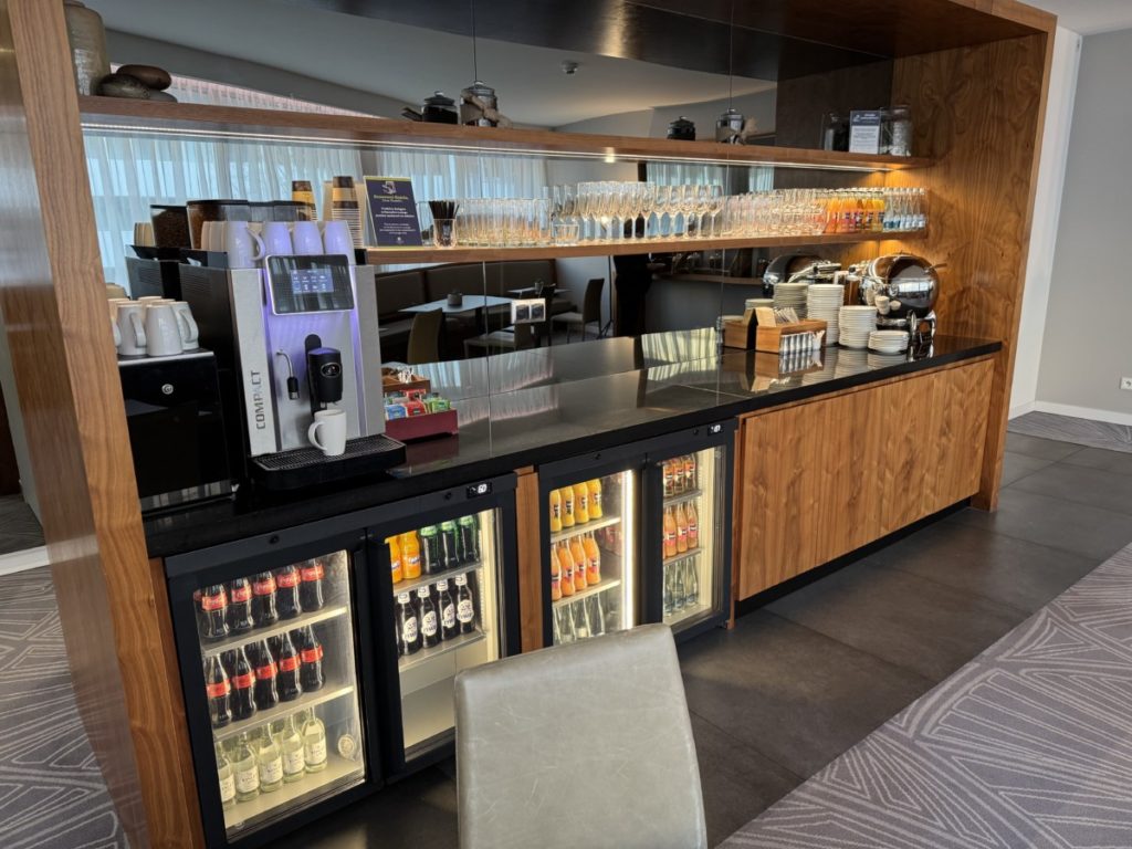 Het ontbijtbuffet was hier nog niet klaargezet maar er werd mij toch aangeraden om in de grote ontbijtzaal te ontbijten omdat er meer keuze zou zijn. Het buffet biedt naast wat versnaperingen ook een koffieautomaat met eronder een aantal koude dranken. Verderop vind je ook nog fruit.