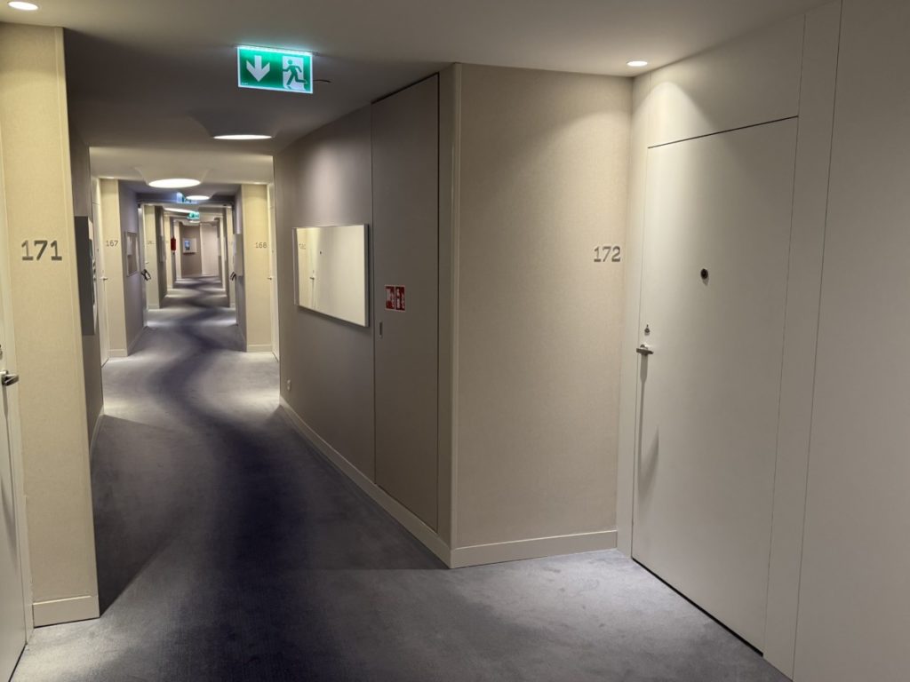 Vervolgens nam ik de lift naar de eerste verdieping waar mijn kamer zich bevond. Ik moest echter nog een behoorlijk stuk lopen door de gang om bij de kamer de komen. De gang gaat namelijk helemaal in het rond en mijn kamer bevond zich precies aan de andere kant van waar de liften zich bevonden. Helaas zijn er ook geen liften aan de kant waar mijn kamer zich bevond.