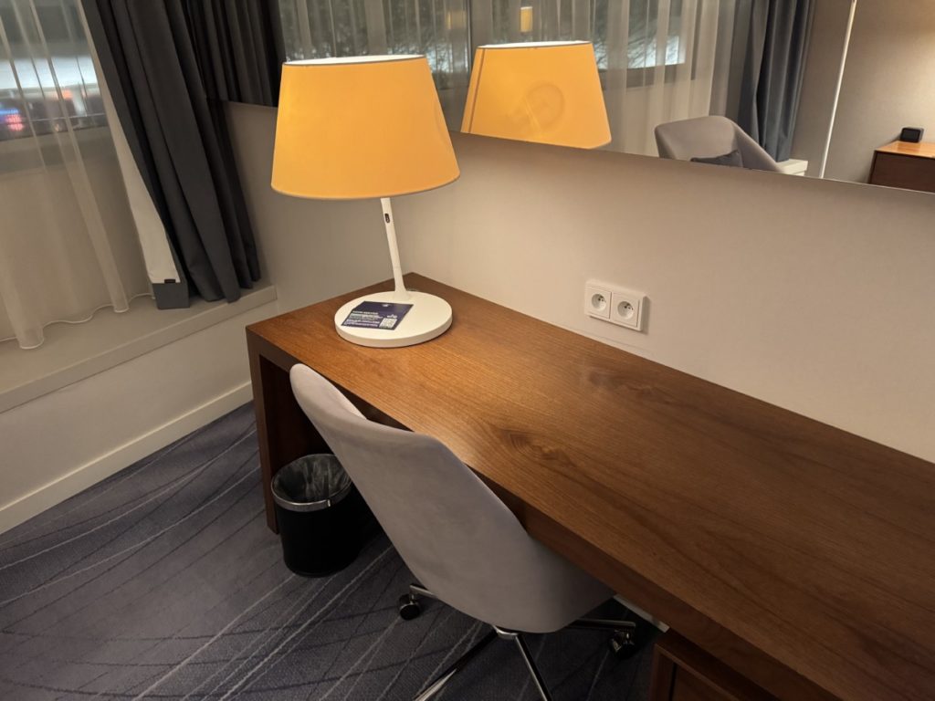 Links van de televisie vind je het bureau. Dit is eigenlijk een verlengde van de tafel onder de televisie. Het bureau is niet heel groot maar biedt wel genoeg ruimte om wat werk te doen. Je vind er ook een comfortabele bureaustoel, een bureaulamp en een spiegel aan de muur. Achter het bureau bevindt zich nog een wat comfortabelere stoel met een rond tafeltje.