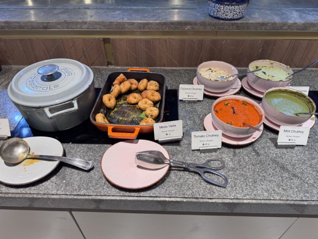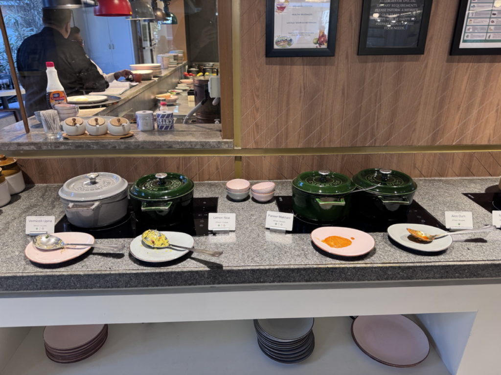 Naast het buffet is er ook een open keuken met live cooking station. Hier kun je vers bereide eiergerechten en Indiase specialiteiten bestellen. Denk bijvoorbeeld aan Indiase dosa, dit is een dunne pannenkoek gevuld met gekruide aardappel en verschillende sausjes.