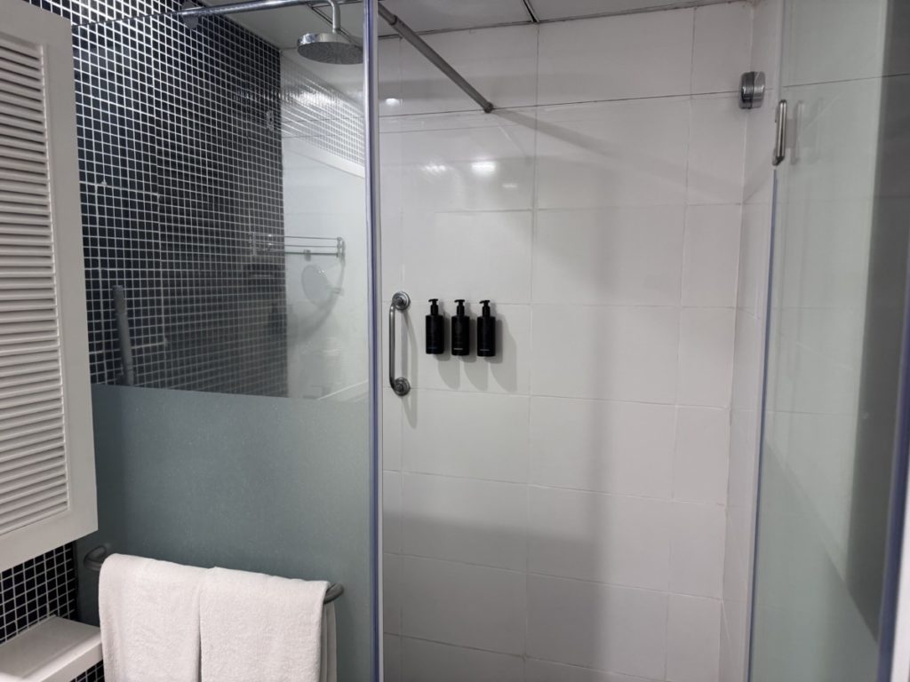 In deze studio is de badkamer toegankelijk vanuit de slaapkamer. In de badkamer is voorzien in een enkele wastafel met grote spiegel, toilet en inloopdouche. Bij de wastafel zijn flacons handzeep en bodylotion aanwezig. Ook is er een dienblad met allerlei amenities, zoals een tandenborstel, oorstaafjes en een scheermesje. Deze worden dagelijks aangevuld.