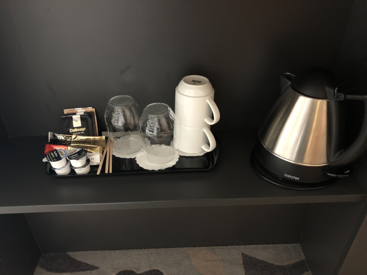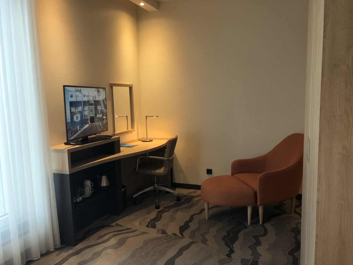 Bij het bureau vind je naast de bureaustoel ook een fauteuil met voetenbankje. Wat me opviel bij dit bureau was dat er geen stopcontacten op zithoogte aanwezig waren. Het enige stopcontact vond ik beneden aan de muur. Onder de televisie vind je de koffie- en theefaciliteiten. Verder is er in deze kamer geen minibar aanwezig.