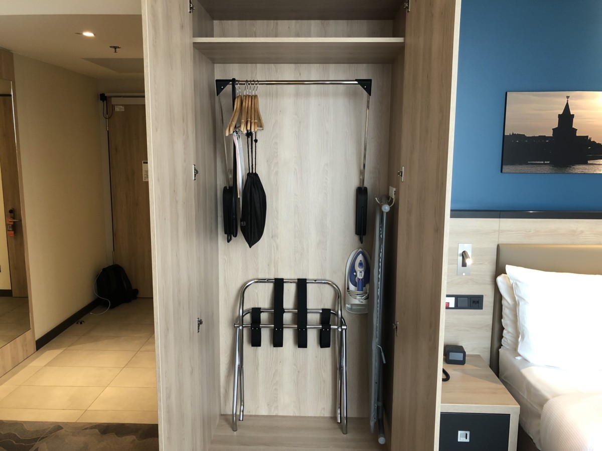 Aan de linkerkant van het bed vind je de telefoon. Daarnaast bevindt zich een kast met o.a. kleerhangertjes, een strijkijzer en strijkplank.
