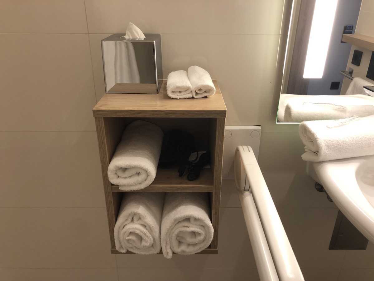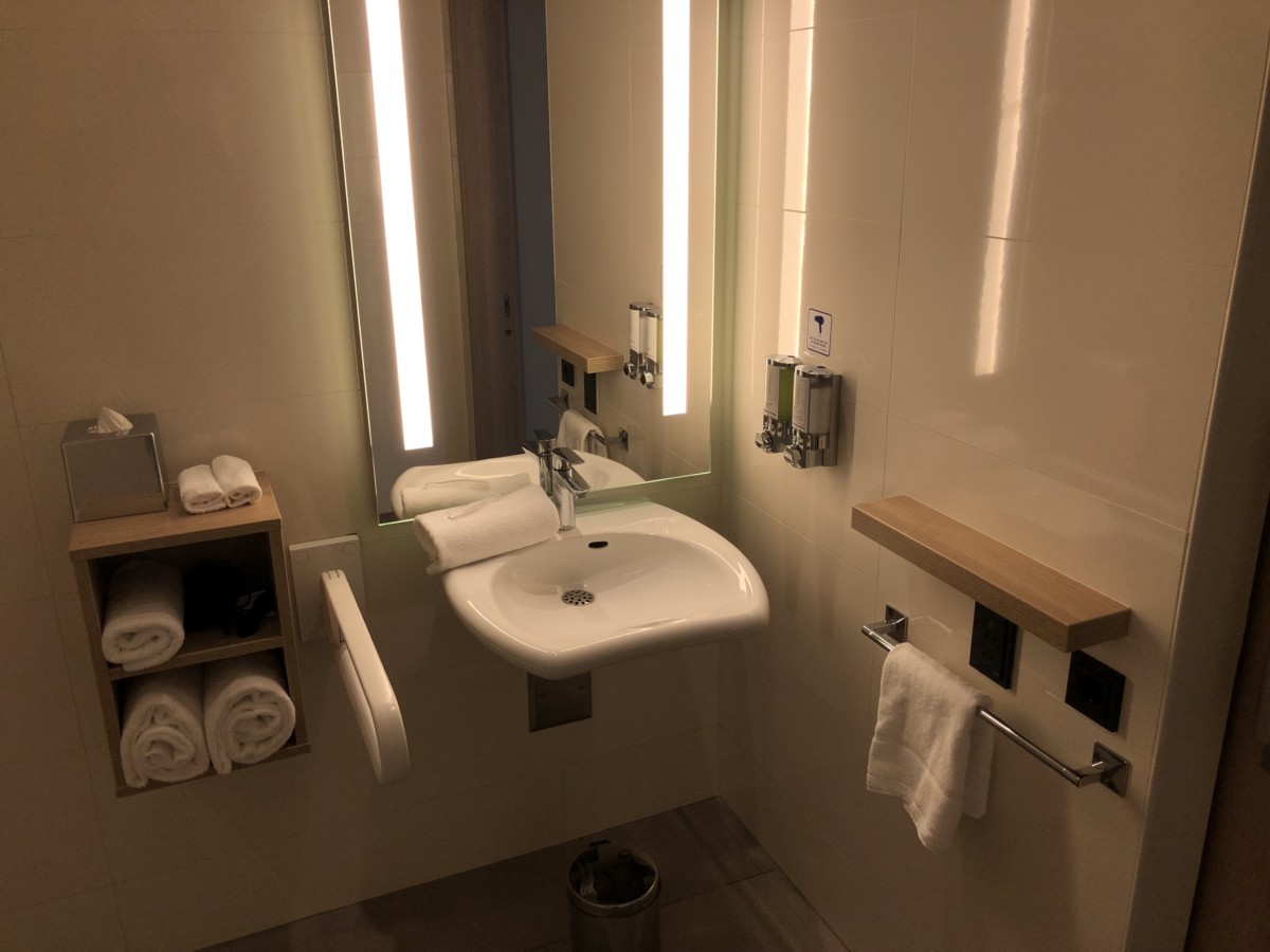In tegenstelling tot de kamer zelf is de badkamer veel ruimer dan ik dacht. Dit heeft er mee te maken dat de kamer ook geschikt is voor mindervaliden. De wastafel vond ik wel wat aan de kleine kant. Verder trof ik overal wel genoeg handdoeken, washandjes, shampoo en zeep aan.