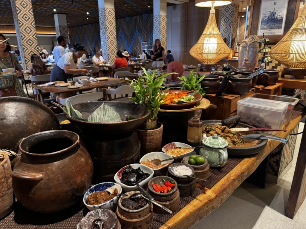 Tijdens dit verblijf hebben we keuze uit ontbijt bij het buffetrestaurant of de Nusa Dua Lounge. De eerste dag kiezen we voor het zeer uitgebreide buffet bij Restaurant Grain. Er is echt een hele ruime keuze met gerechten uit alle windstreken. Van yoghurt met granen en vers fruit, tot een Engels, Frans, Amerikaans of Chinees ontbijt. Aan niets ontbreekt het! Ook zijn er enkele heerlijke Indonesische gerechten.