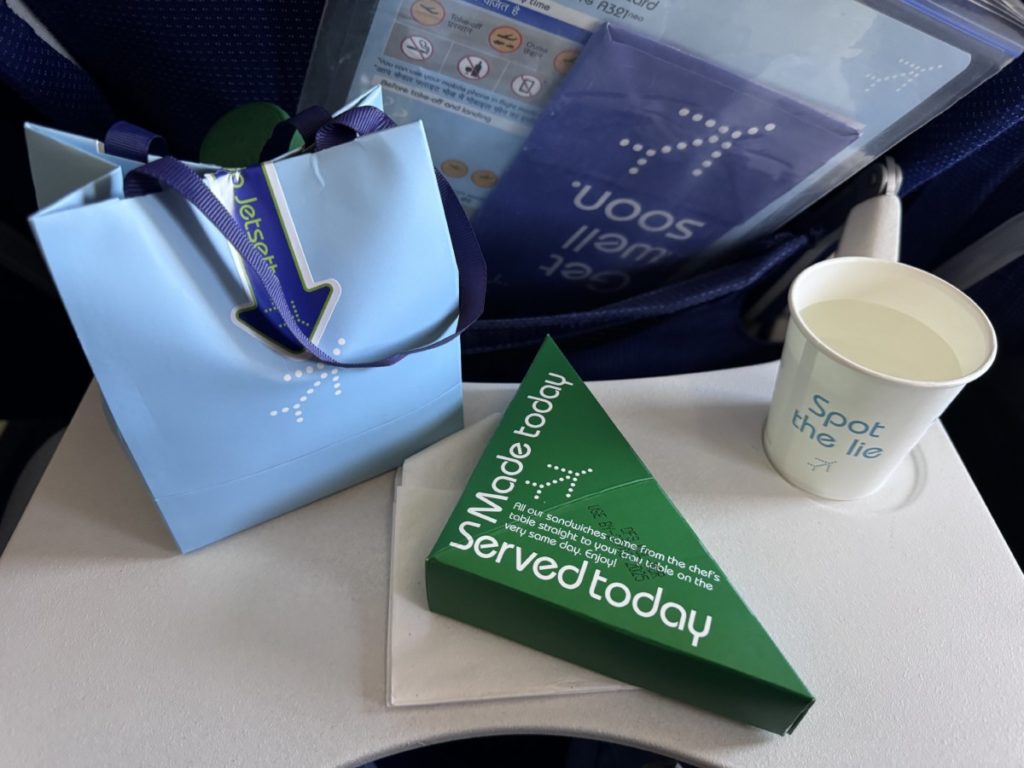 In deze review over de Airbus A320 van IndiGo zal ik ook de maaltijden en service aan boord bespreken. Als low cost carrier serveert IndiGo geen gratis drankjes, maaltijden of snacks aan boord. Wel krijgen alle passagiers een bekertje bronwater. Extra’s kunnen aangeschaft worden van het buy-on-board menu. Dat overigens voor Europese begrippen zeer schappelijke prijzen heeft. Het is ook mogelijk om vooraf een maaltijd of snack te bestellen. Deze krijg je dan tijdens de vlucht bij je stoel geserveerd.