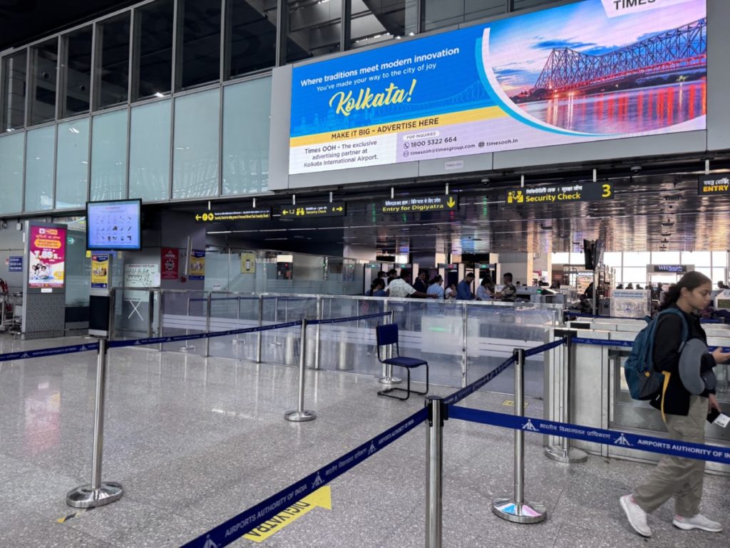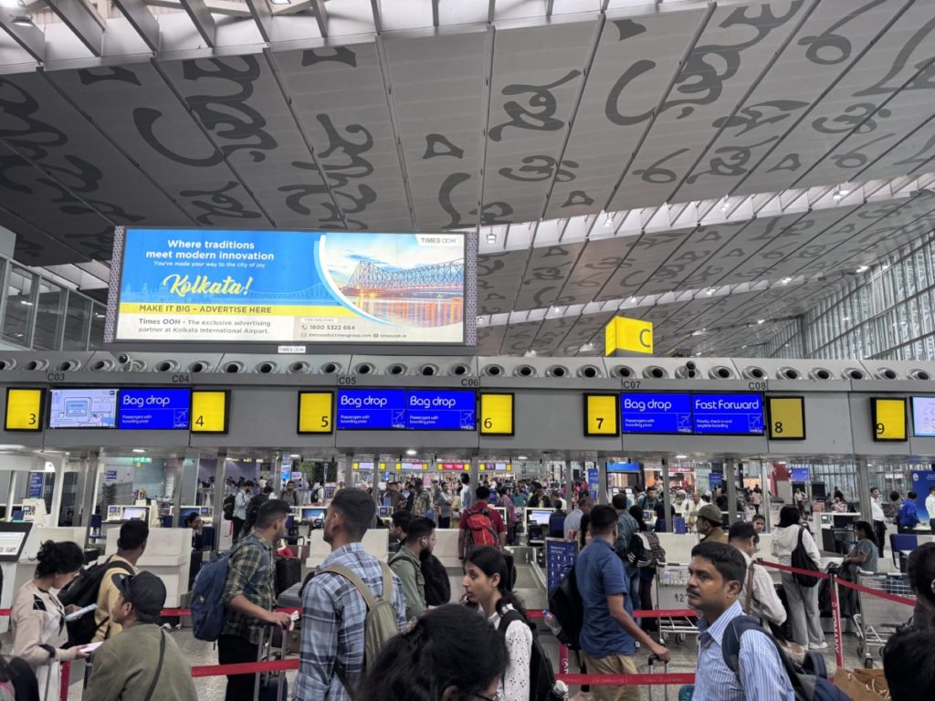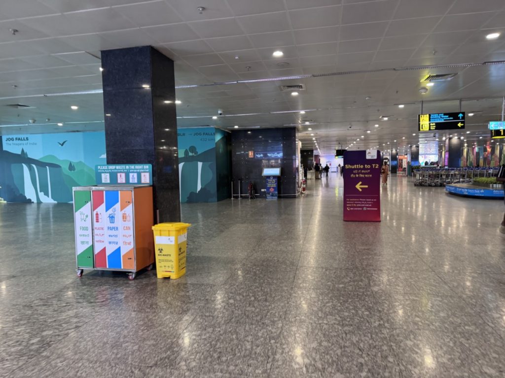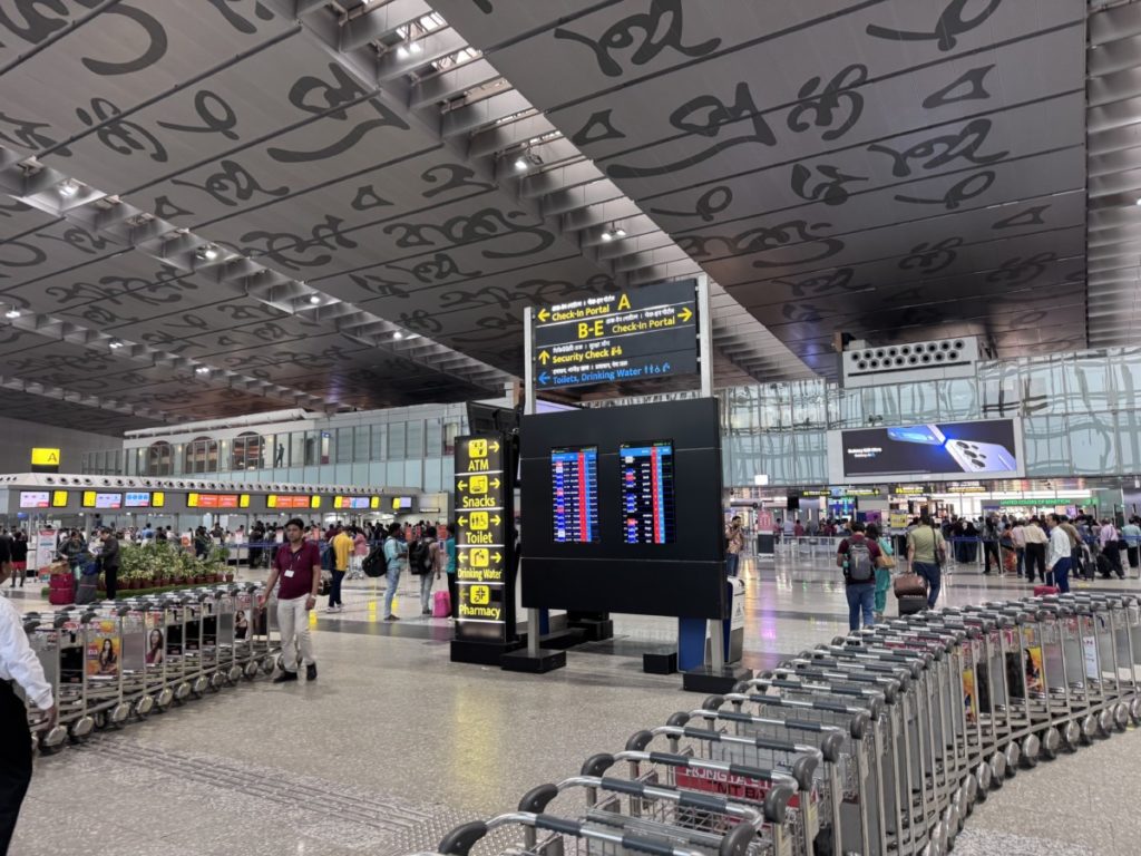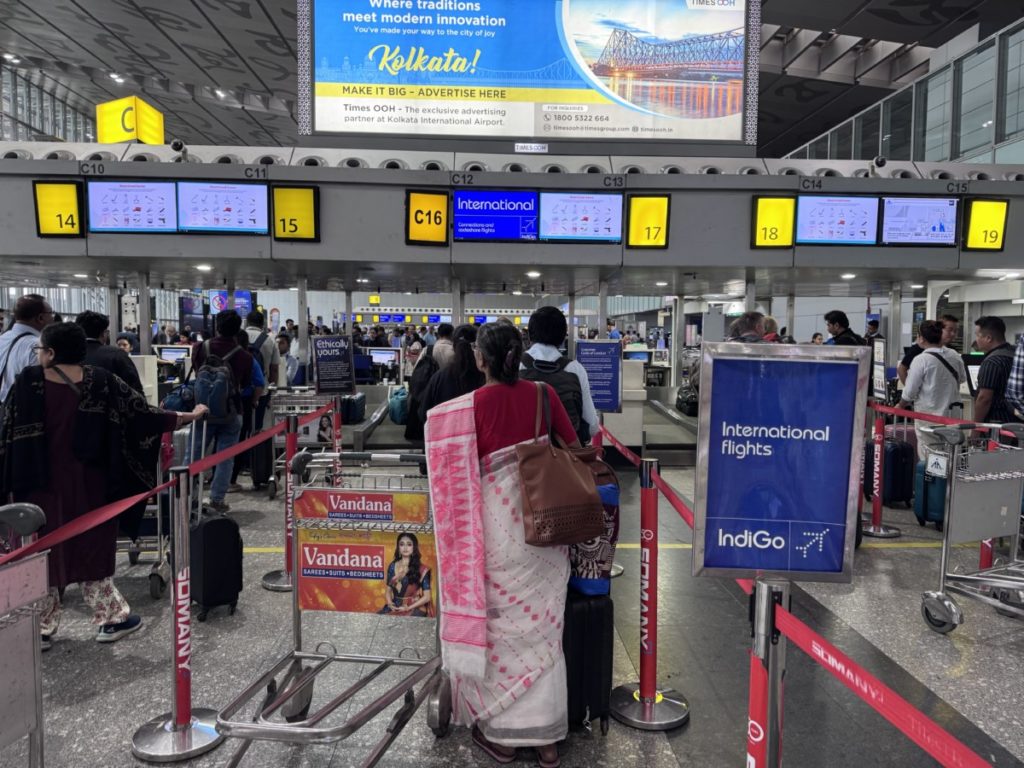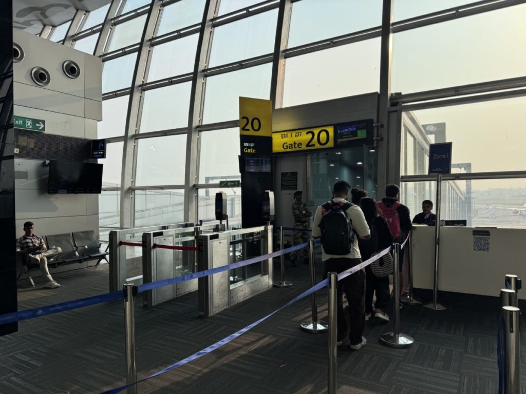 Na een vroege taxirit van het Hyatt Centric Bengaluru naar het vliegveld komen we ruim op tijd aan voor de check-in en security check. Althans, dat denken we dan nog. We gaan netjes in de (flinke) rij staan bij de IndiGo counters. Na een hele tijd wachten zijn we eindelijk aan de beurt. Er wordt ons echter mede gedeeld dat we in de verkeerde rij staan. Voor niets zo lang gewacht dus en heel duidelijk stond het ook niet aangegeven dat deze rij enkel voor binnenlandse vluchten is bedoeld.