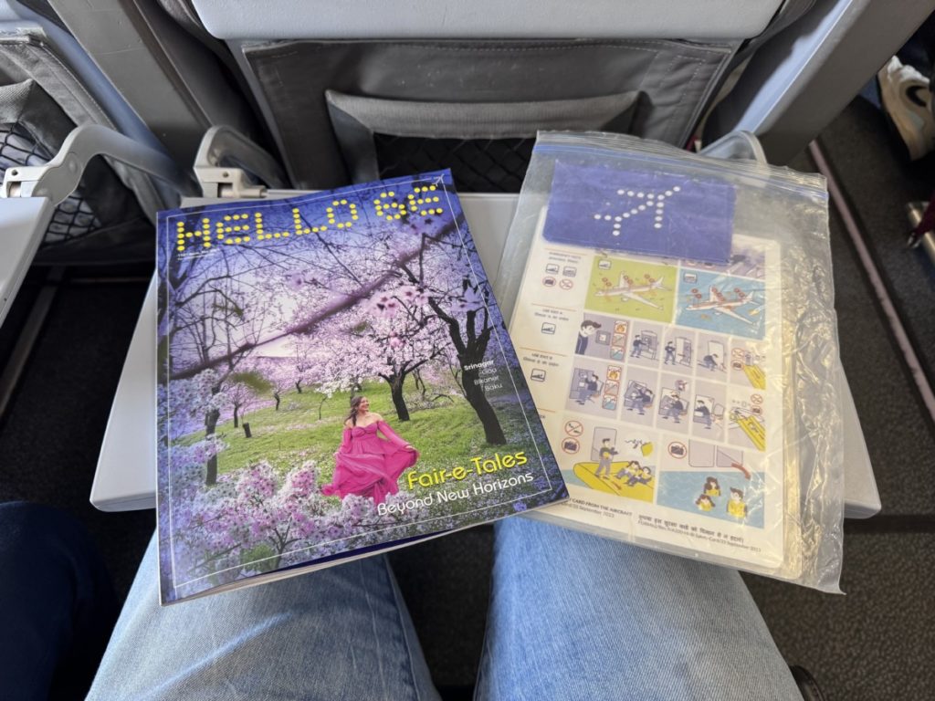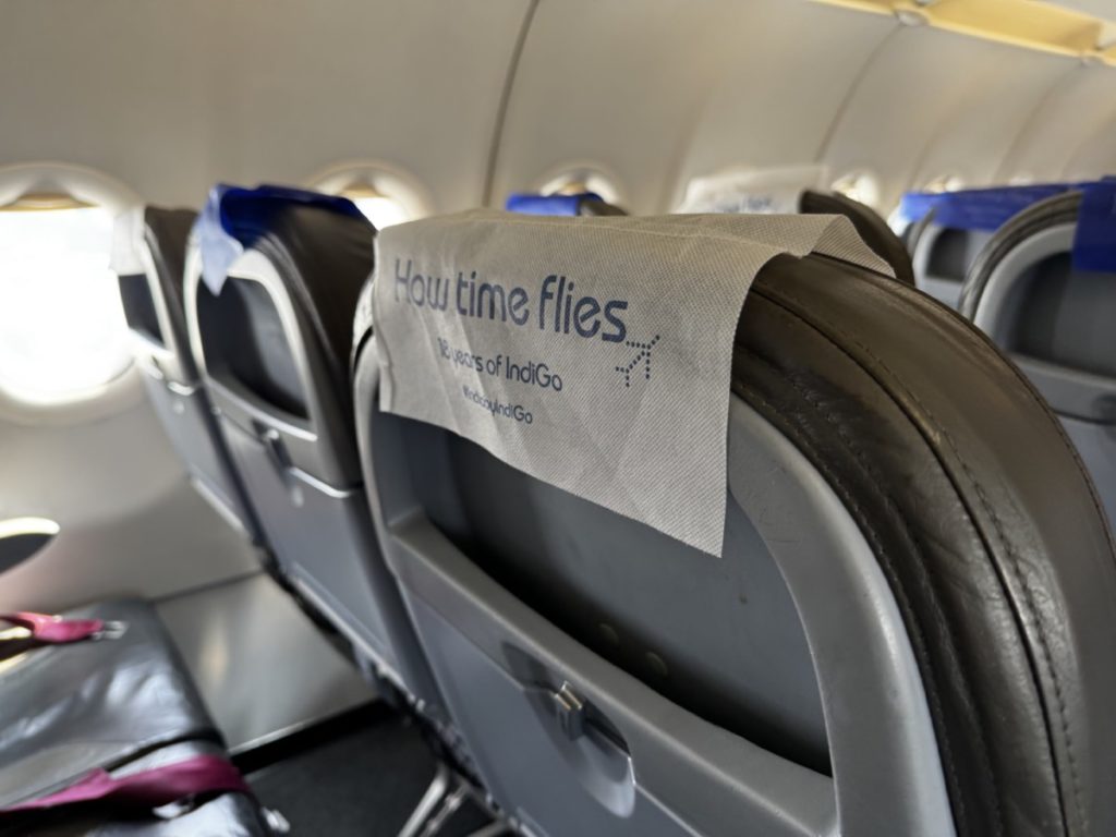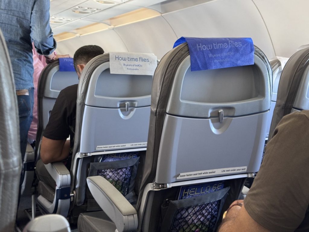 In deze Airbus A320 heeft IndiGo de gebruikelijke 3-3 configuratie. De stoelen zijn voorzien van lederen bekleding en elke hoofdsteun heeft blauwe of witte accenten. De hoofdsteun is trouwens niet individueel in te stellen. Verder beschikt elke stoel over een prima formaat tafeltje dat ook nog eens dichter naar je toe te halen is. Tot slot is er nog wat opbergruimte in de stoel voor je. Hierin treffen we ook de veiligheidskaart en het inflight magazine Hello6E.