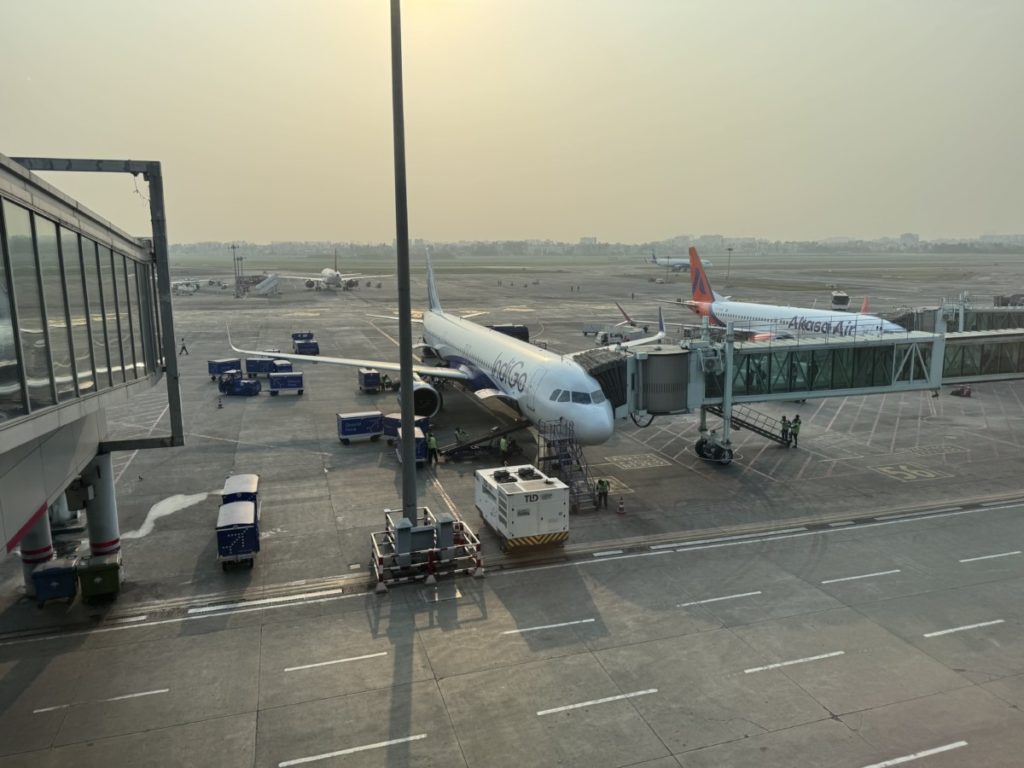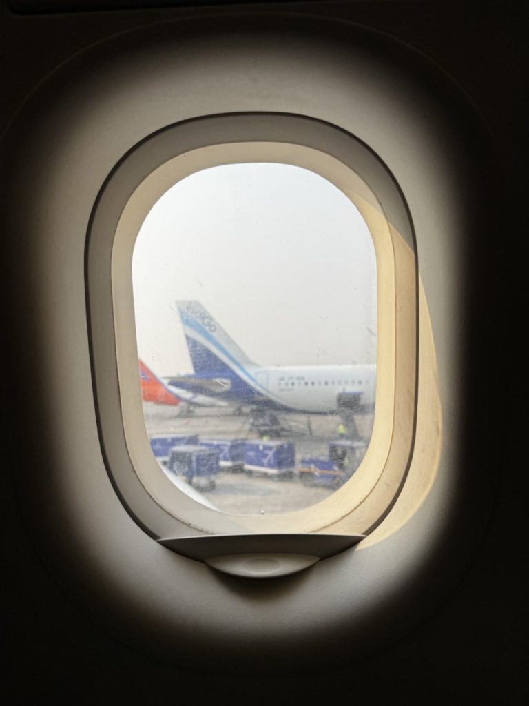 Als we goed en wel zitten gaat niet veel later de deur van het vliegtuig dicht. We vertrekken echter nog niet. Zo’n 10 minuten later volgt er een mededeling vanuit de cockpit: wegens slecht weer in Bengaluru zullen we later vertrekken. Uiteindelijk vertrekt het toestel met een vertraging van 1 uur en 5 minuten naar Bangalore. Veel gehaast en gestress voor niets dus. Soms heb je die pech.