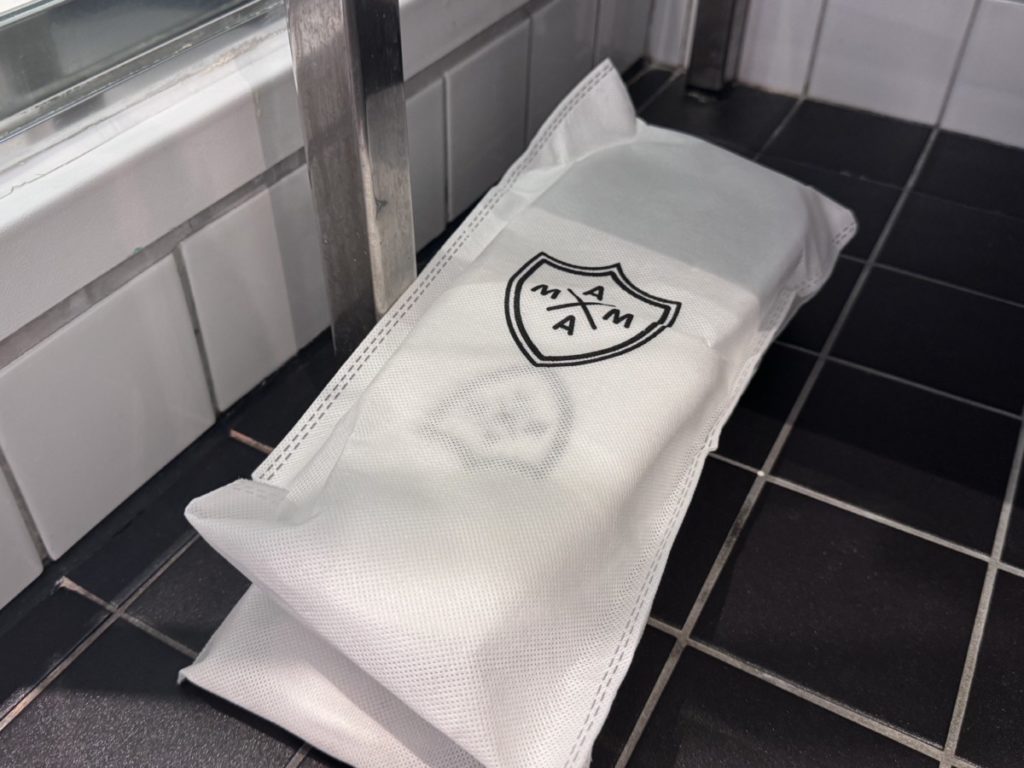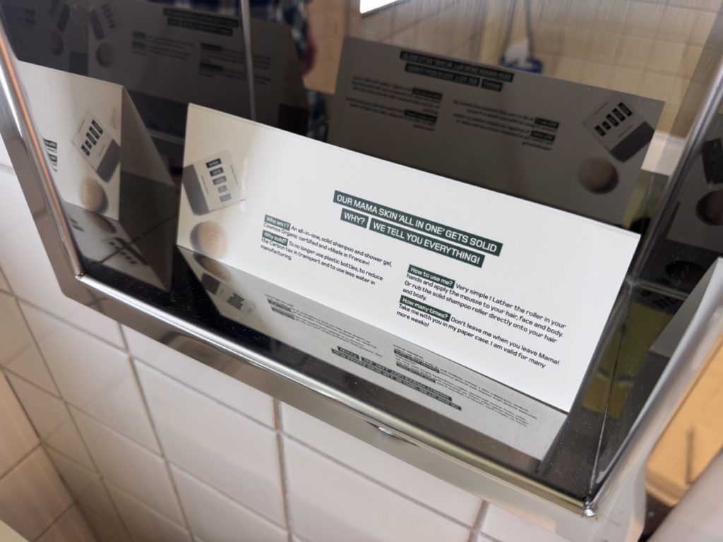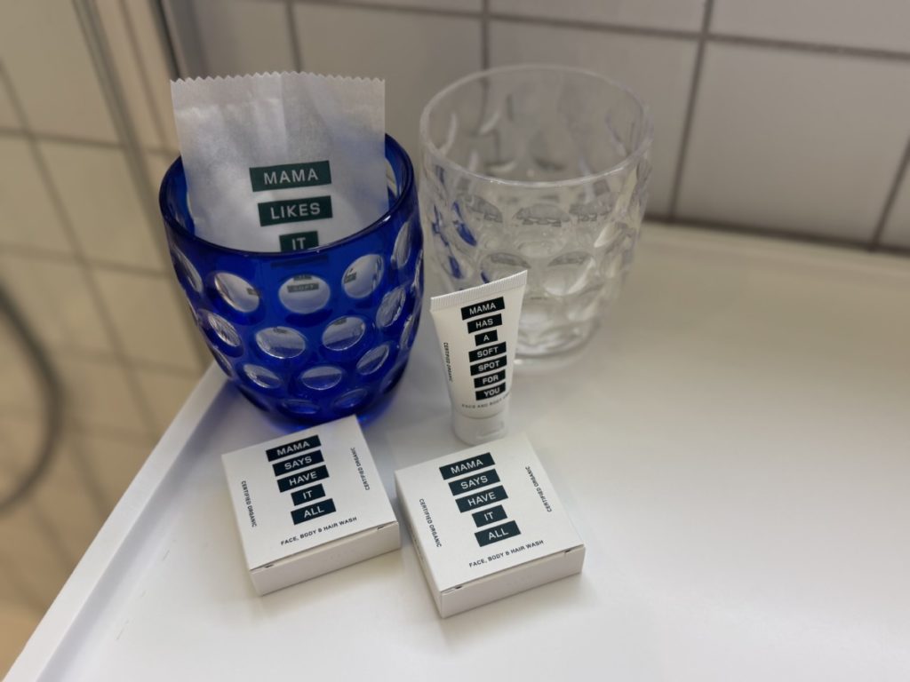 In deze Medium Mama kamer is de badkamer toegankelijk via de deur gelijk rechts bij binnenkomst. De badkamer vind ik wel wat aan de kleine kant, voordal de douche biedt weinig bewegingsruimte. Er is dan wel weer gedacht aan een regendouche. Verder zijn er biologische amenities van Mama Shelter zelf. Denk aan handzeep en bodylotion. Het blokje handzeep is ook te gebruiken in de douche als shampoo en showergel. Extra amenities zijn via de receptie aan te vragen.