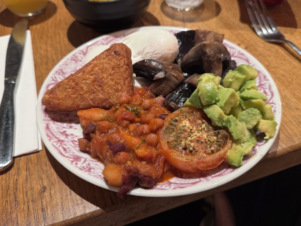 Het buffet is opgesteld achterin het restaurant bij de bar. Er is keuze uit zowel warme als koude gerechten. Uiteraard is er een echt Engels ontbijt met roerei, aardappeltjes, champignons, tomaten uit de oven en gebakken spek. Maar er zijn ook veel broodsoorten, vers fruit, yoghurt en granola. Qua dranken is er keuze uit koffie, thee, water en vruchtensap. De koffie is overigens wel erg slap.