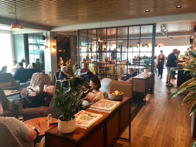 Eenmaal binnen is de ruimte alles behalve groot. Het is wel erg huiselijk ingericht, bijna à la Cathay Pacific. Er zijn veel gemeenschappelijke zitplekken; banken en hoekjes. Bij het raam heb je enigszins uitzicht op het platform.