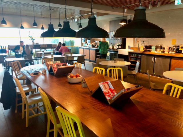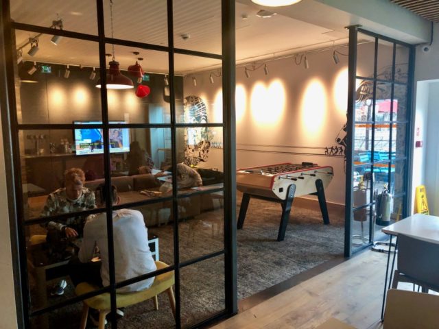 Verder in de lounge is rechts het buffet, in het midden wat cafe-stijl stoelen en een grote tafel, en links reserveerde ruimtes en een relax ruimte met TV en tafelvoetbal. Er is ook een klein buitenterras.