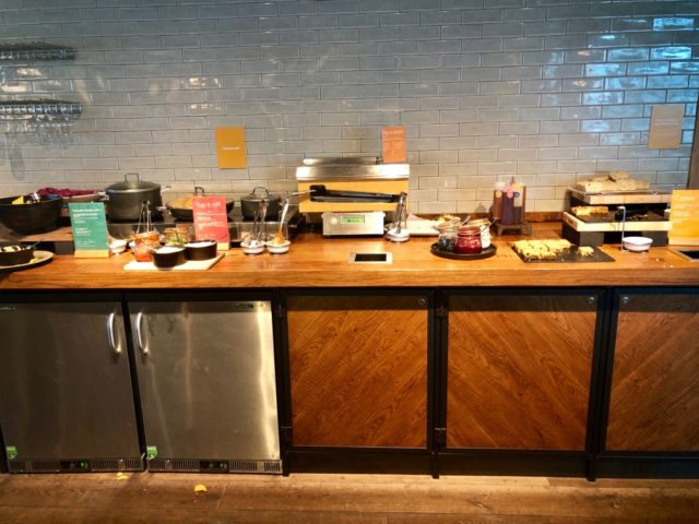 De catering in deze lounge is zeer matig te noemen. Drie soorten cake en qua warme opties aardappelpartjes, pulled pork en bonen. Dat was het. Geen broodje, crackers, chips, niks. Het drankaanbod is dan wel weer vrij ruim op alcoholisch vlak met twee soorten tap, wijnen en sterk. Naar goed Brits gebruik werd hier al tijdens de ochtenduren gretig gebruik van gemaakt. Er is een beperkt aantal frisdranken beschikbaar en verder nog een koffiemachine.