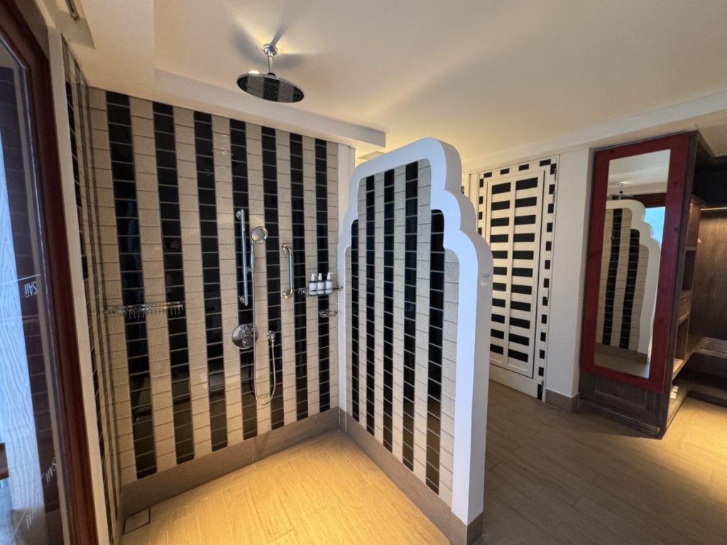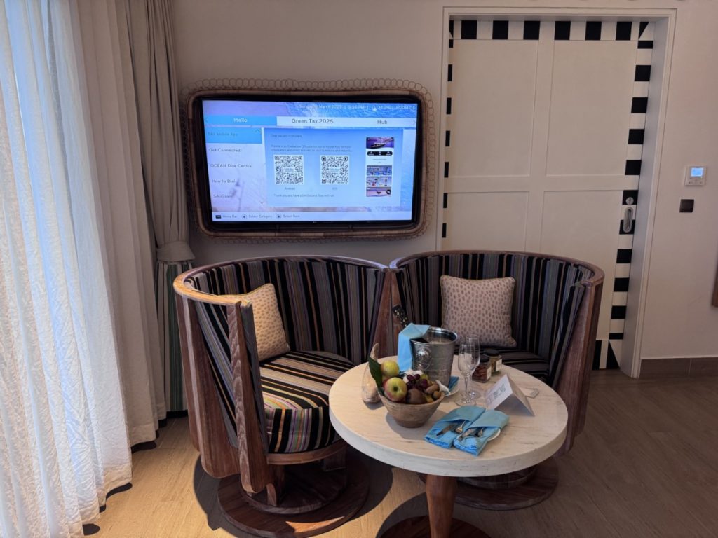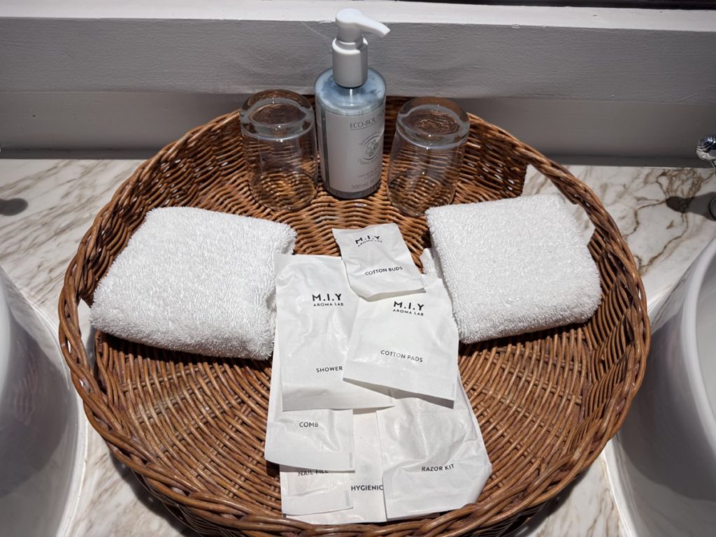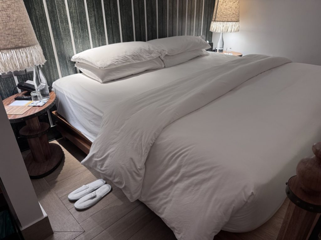 Natuurlijk zijn ook wel wat verbeterpunten. Zo vind ik het aantal stopcontacten wel te beperkt. En de tafel met stoelen ziet er mooi uit, maar zit eigenlijk voor geen meter. Wat me ook wel opviel is dat, voor zo’n dure kamer, de minibar niet is inbegrepen. Wel stond er een mooi welkomstgeschenk voor ons klaar bij aankomst.