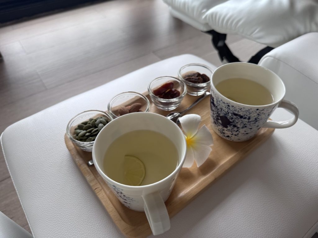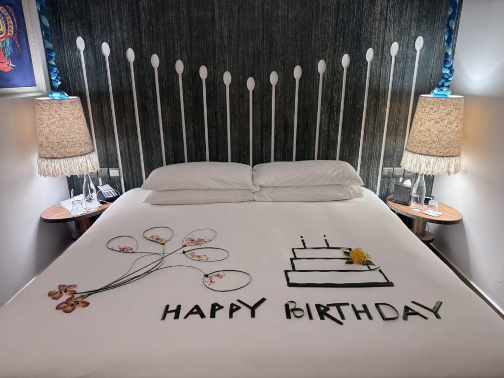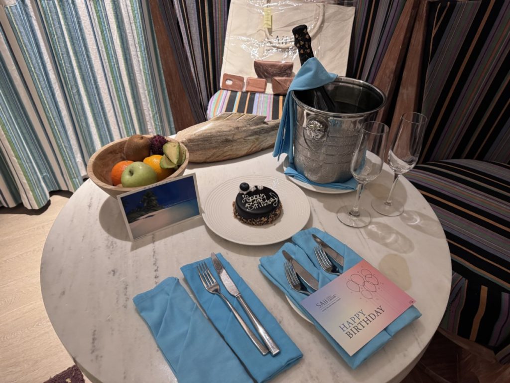 Bij aankomst stond ons een welkomstgeschenk te wachten in de vorm bij een schaal fruit, hartige snacks en een fles prosecco. En op de verjaardag van mijn reisgenoot stond er zelfs een taartje, compleet met verjaardagspakket én een mooie versiering op het bed.