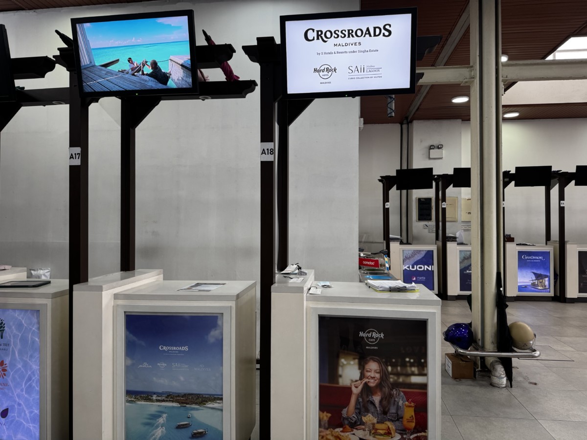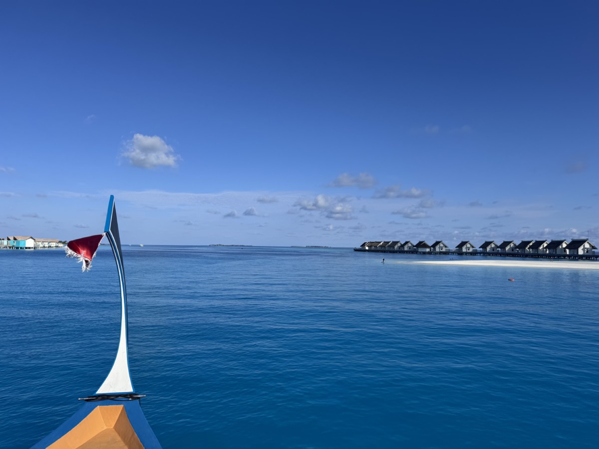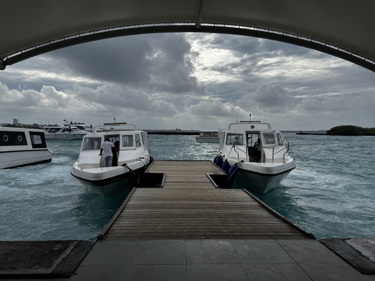 Eenmaal bij de uitgang treffen we een chaotisch tafereel van medewerkers die bordjes met namen van hotels ophoog houden. Het zijn er zo veel dat het niet echt makkelijk is om het juiste hotel te vinden. Verderop zijn ook desks voor elk hotel. SAii Lagoon Maldives – Curio Collection by Hilton heeft hier desk A17-18. Hier treffen we een vriendelijke medewerker die onze bagage een label geeft. We worden gevraagd te wachten op de aankomst van enkele andere passagiers. En daarna gaan we naar de speedboat die ons naar het resort brengt. Na ongeveer een half uurtje wachten worden we weer opgehaald om naar de boot te gaan. Het vertrekpunt is direct tegenover de uitgang van het vliegveld.