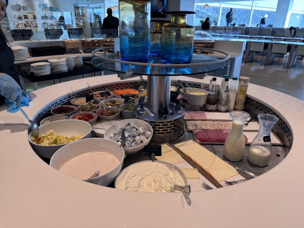 Aangezien de lounge opgedeeld is in twee delen, zijn er twee plekken met een buffet. De ene is wat groter dan de andere. Aangezien we in de ochtend een bezoek brengen aan deze lounge, is er ontbijt te vinden. Zo zijn er ontbijtgranen en yoghurt of melk. Maar ook is er Engels ontbijt te vinden met nog verschillende andere ontbijtopties.