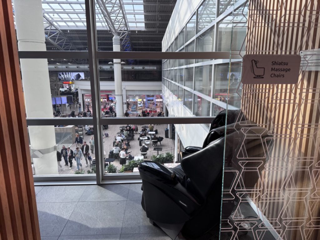 Verder zijn er twee massagestoelen te vinden. Vanuit hier heb je een leuk uitzicht op een deel van Pier A. De massagestoelen zijn te vinden bij de douches en sleeping pods.