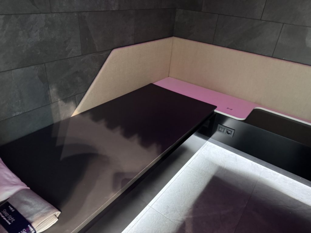 Qua inrichting zijn er heel veel verschillende soorten zitgedeeltes die comfort bieden voor de verschillende soorten reizigers. Even een snel kopje koffie, of juist nog een werkbespreking of helemaal ‘zen’ worden. Deze lounge is daar ideaal voor. Er is gewerkt met fijne natuurlijke materialen, kleuren en verschillende soorten verlichting. Dit maakt deze lounge zeer comfortabel naar mijn mening.