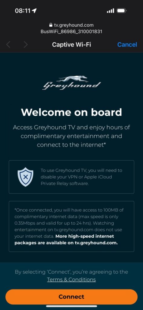 Er is ook WiFi aanwezig in deze Greyhound bus. Je kunt hier eenvoudig mee verbinden, al werkt deze niet de gehele rit optimaal. Je kunt via de entertainment website van Greyhound ook luisterboeken afspelen of spelletjes doen.