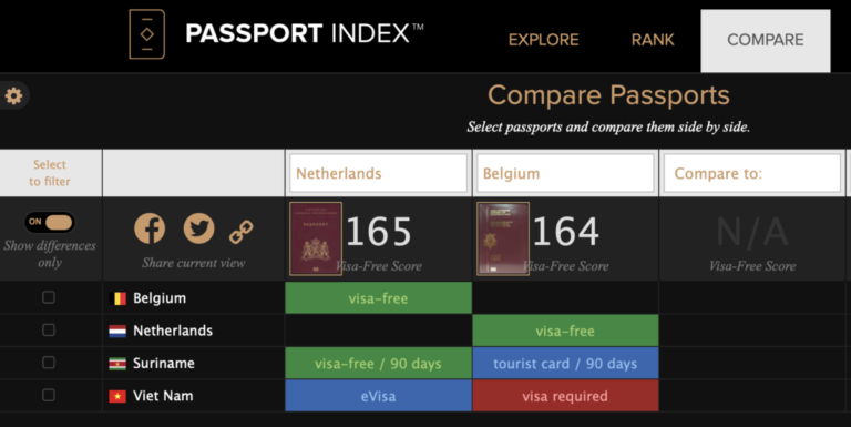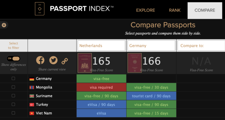 Op de site kun je ook landen met elkaar vergelijken en dat is wel interessant. Wat is bijvoorbeeld het verschil tussen een Nederlands en een Duits paspoort?