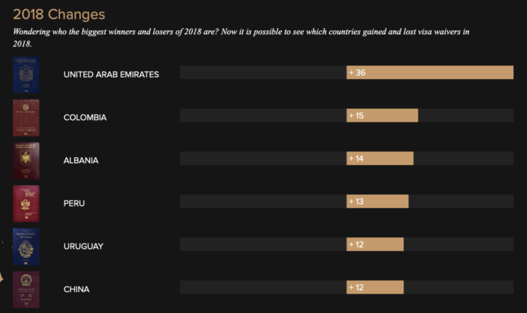 Als er puur gekeken wordt naar het aantal landen dat visumvrij bezocht mag worden, dan is het meest waardevolle paspoort van de Verenigde Arabische Emiraten! In totaal mogen 167 landen zonder visum vooraf bezocht worden: 113 totaal visumvrij en 54 met een visa on arrival. In 2018 zijn er kennelijk 36 landen bijgekomen waar zonder visum vooraf naartoe gereisd kan worden.