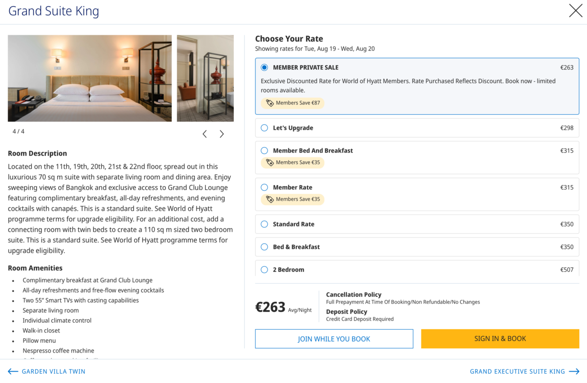 Zoals altijd met dit soort promoties is de korting per hotel zeer uiteenlopend. Het Andaz Amsterdam Prinsengracht geeft bijvoorbeeld maar een magere besparing. Maar bij hotels in bijvoorbeeld Bangkok is deze promotie meer de moeite waard. Hieronder het voorbeeld van het Grand Hyatt Bangkok.