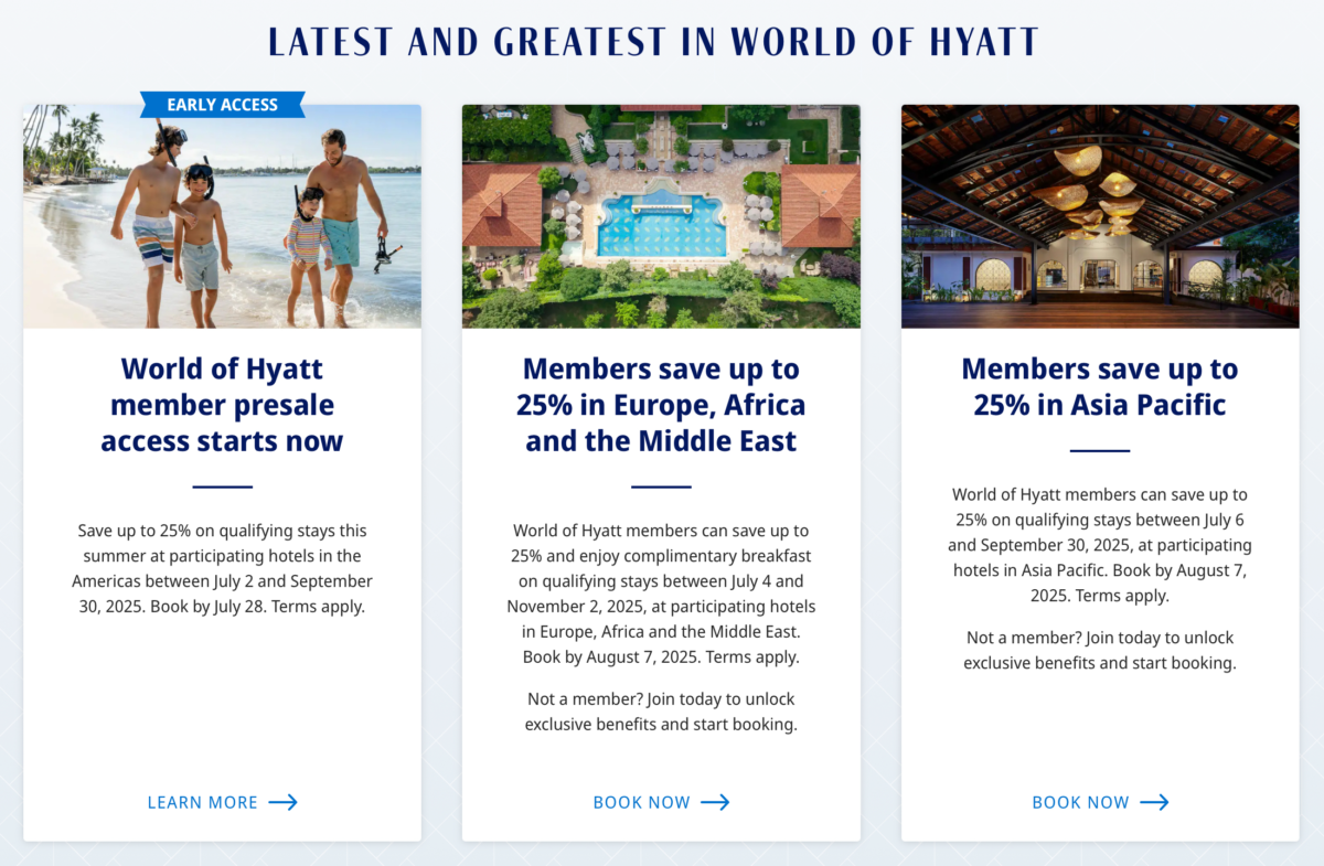 Hyatt komt met een sale speciaal voor leden, waarbij kortingen tot 25% en (in sommige gevallen) gratis ontbijt wordt gegeven. Vrijwel alle regio’s in de wereld doen mee met deze promotie. World of Hyatt leden kunnen nog de hele zomer bij één of meerdere van de deelnemende hotels profiteren van de korting.