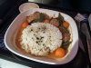 RIX-CDG met BT Warme maaltijd met een warm doekje vooraf. Rijst was nog niet helemaal goed gekookt, maar zeker lekker van smaak.